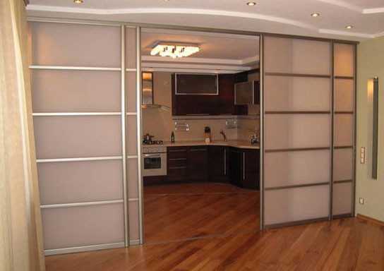 Правила требуют наличия между кухней и комнатой стационарной или сдвижной перегородки или двери. Как выход из положения владельцы квартиры частично разбирают ненесущую стену, а в образовавшемся проеме монтируют сдвижную перегородку. Эта конструкция в сложенном виде не разделяет пространство двух помещений, а при необходимости сдвигается с плотным притвором. Часто устанавливается легкая пластиковая перегородка, которая после посещения контролирующих органов и выписанного разрешения на перепланировку, демонтируется и убирается на балкон или в кладовку. Если вы планируете оставить конструкцию, то стоит подобрать красивый и функциональный вариант.