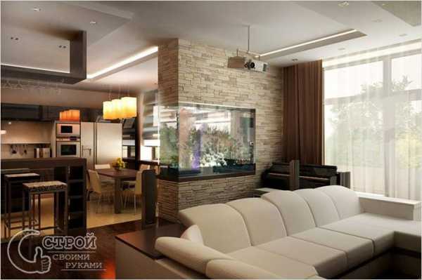 Любая мебель может определить разделение комнаты. Это может быть диван, поставленный спинкой к кухне или большой аквариум. Используется книжный стеллаж, габаритная мебель, даже обеденного стола, поставленного на границе кухни, достаточно для размежевания помещения. Этот способ самый доступный, с его помощью комната делится быстро и без дополнительных вложений в материалы и работу.