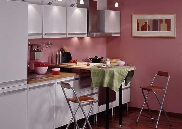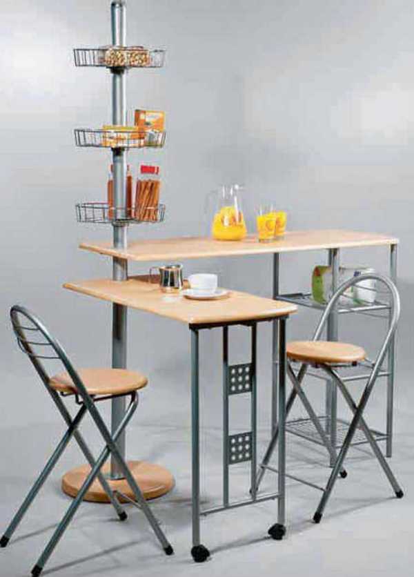 Складная барная стойка. Если в жилом помещении с маленькой кухней проживает многочисленная семья, то именно складная (раскладная) барная стойка станет оптимальным вариантом. В собранном состоянии такая конструкция выглядит, как небольшая тумбочка, помещающаяся в любом свободном углу (у стены), и ее поверхность вполне достаточна для перекуса в течение дня или чашки утреннего кофе. Для обеда в полном составе семьи достаточно лишь быстро поднять и поставить на ножки, опущенную вниз столешницу.