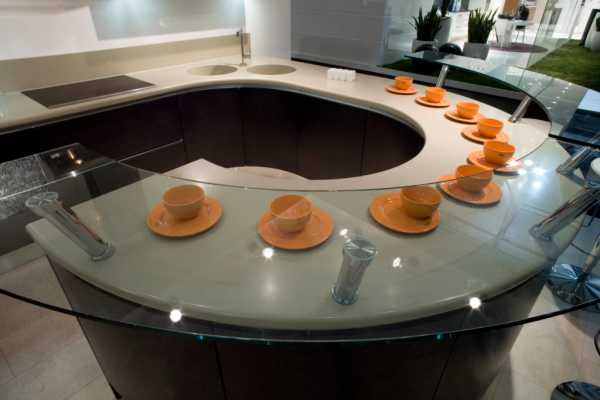 Особенностью стеклянных стоек является «воздушный» внешний вид, огнестойкость и устойчивость к влаге. При этом прозрачные столешницы нельзя назвать практичными, поскольку, несмотря на большую толщину (не менее 30 мм), стекло может разбиться в процессе эксплуатации. Дополнительным недостатком является и высокая цена изделия.