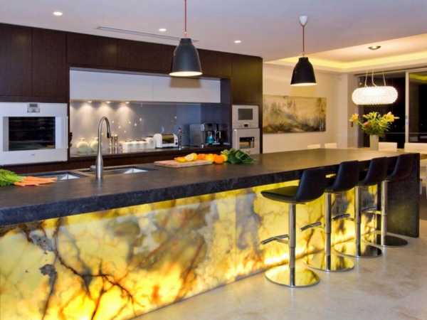 Зону барной стойки зачастую снабжают дополнительной подсветкой. Даже если она является лишь продолжением кухонного гарнитура, точечные светильники существенно облегчат процесс готовки.