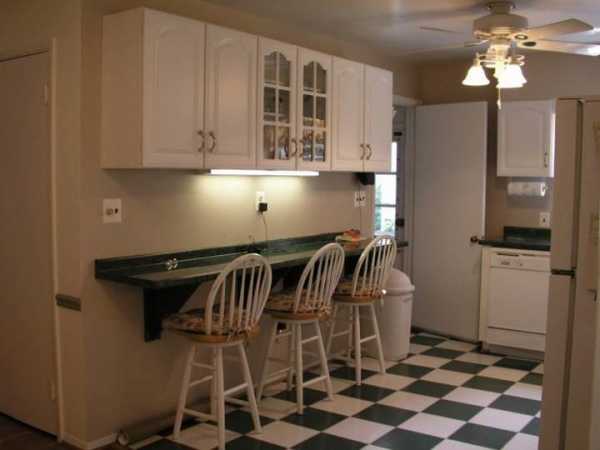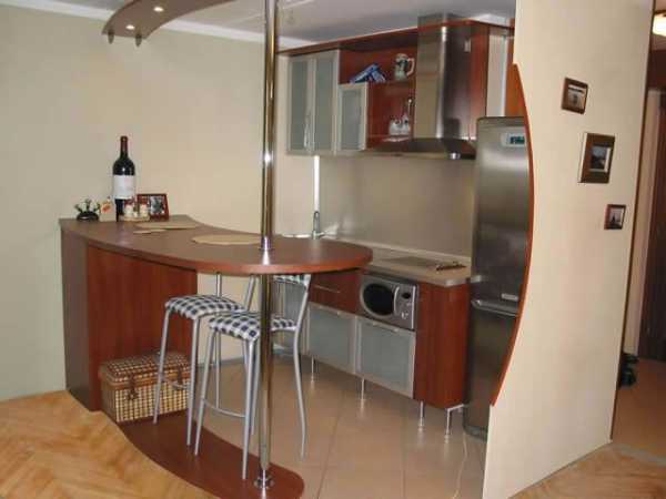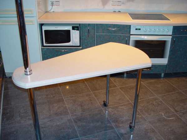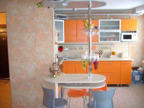 При совсем небольших размерах кухни можно установить маленькую барную стойку мобильной конструкции, имеющую поворотный, выдвижной или откидной механизм, что позволяет не загромождать кухню, устанавливая предмет лишь по необходимости и легко убирая обратно.