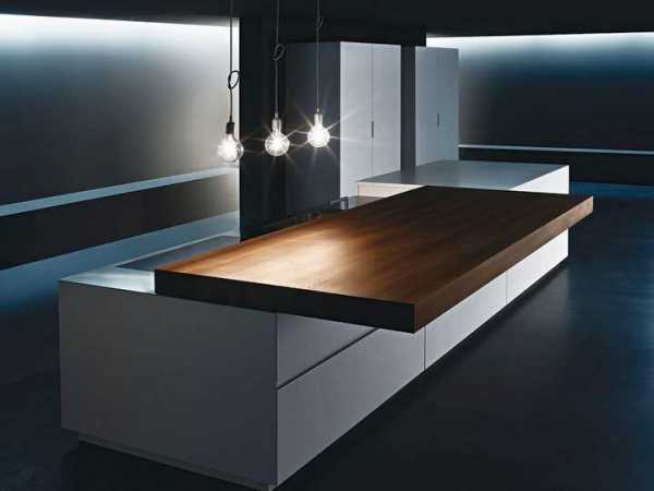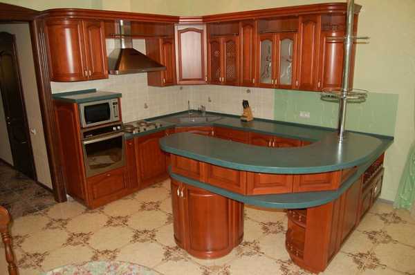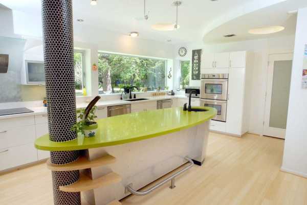 - Островная. Барные стойки для кухни больших размеров могут располагаться отдельно от рабочего гарнитура в виде острова. Помимо различных функциональных секций типа плиты, мойки, сушки, небольшого холодильника и т.д., стойка служит полноценным обеденным столом.