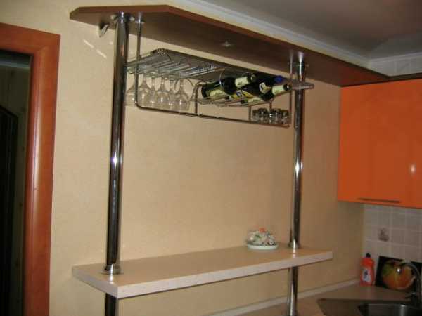 В совмещенных моделях в качестве опоры наиболее чаще используют трубные конструкции. На трубе-опоре располагают рейлинговые системы для хранения фруктов, стаканов, бокалов и прочих барных атрибутов.