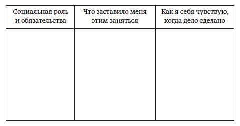 Вспомните все ваши социальные роли, все возложенные на вас обязательства и добровольные занятия. Заполните таблицу и честно признайтесь себе в возникающих эмоциях.