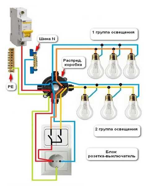 Фазы розеток и питающий кабель скручиваются вместе, после чего подключаются к общему зажиму выключателя с двумя клавишами. От последнего уходят 2 отдельных провода на осветительный прибор.