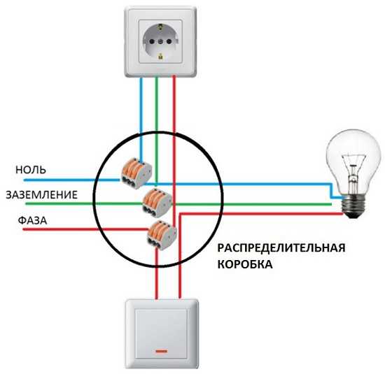 Если светильник расположен рядом с выключателем или розеткой, то целесообразно подключить «ноль» непосредственно от последней. Если же светильник достаточно удален, то в целях экономии провода и большей эстетичности нулевой провод лучше подключить в распределительной коробке.