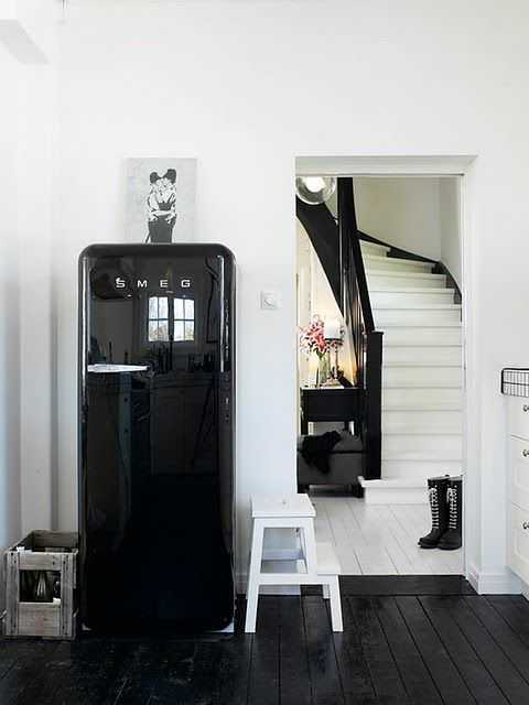 Любители нестандартных решений могут и вовсе вынести холодильник за пределы кухни. С таким вариантом расположения холодильного шкафа нужно быть осторожным. Если на кухне холодильник почти в любом месте смотрится уместно, то в интерьере жилой комнаты такой «гость» может выглядеть странно.