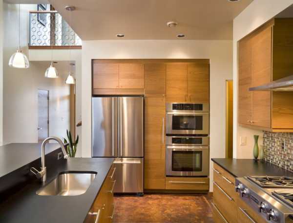 Встроить холодильник в кухне не составляет проблем, ведь его размер примерно равен объему стиральной машины или двух дверному шкафу. Обычно он отлично помещается под рабочей поверхностью. Такой вариант — настоящее спасение для мини — кухонь в квартирах студиях.