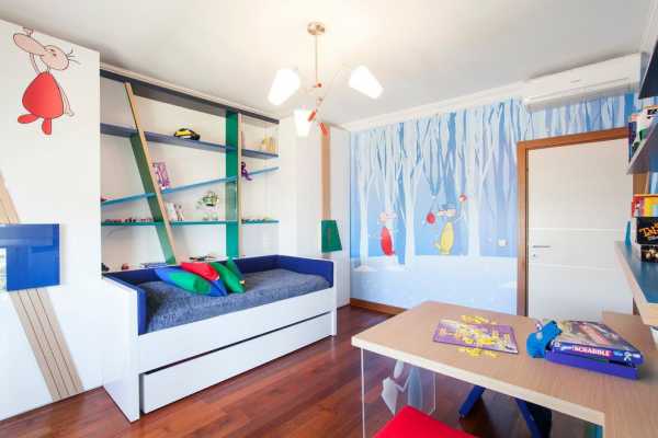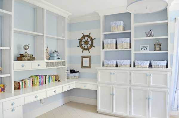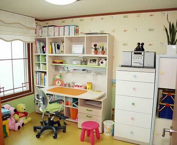 Значительно сэкономить пространство позволят открытые стеллажи. Пока ребенок маленький на них легко разместятся книжки и игрушки, которые со временем уступят своё место школьным принадлежностям. При этом углы на полках обязательно должны быть закруглены, а сами полки не перегружены предметами.