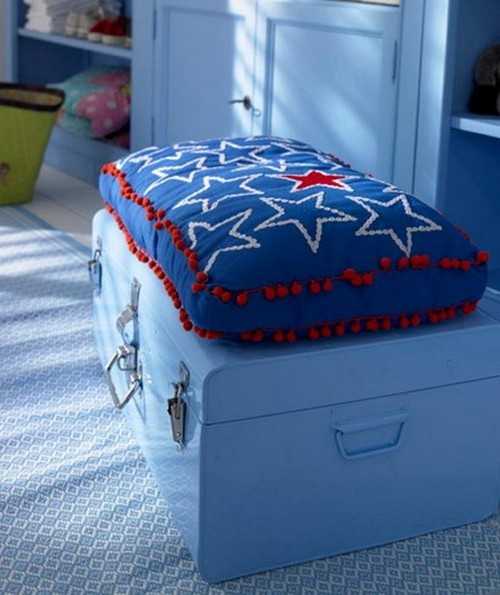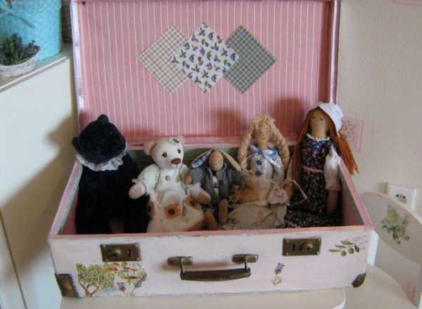 Если в доме есть большой, старый чемодан, из него можно сделать оригинальный сундук для хранения детских игрушек. Такой сундучок можно хранить как под кроватью ребенка, так и в любом удобном месте комнаты. В таком сундучке мальчики могут хранить игрушки для игры в пиратов, а девочки могут хранить в нем игрушечные украшения и драгоценности, косметику, или сделать из сундука гардеробную для своих кукол.