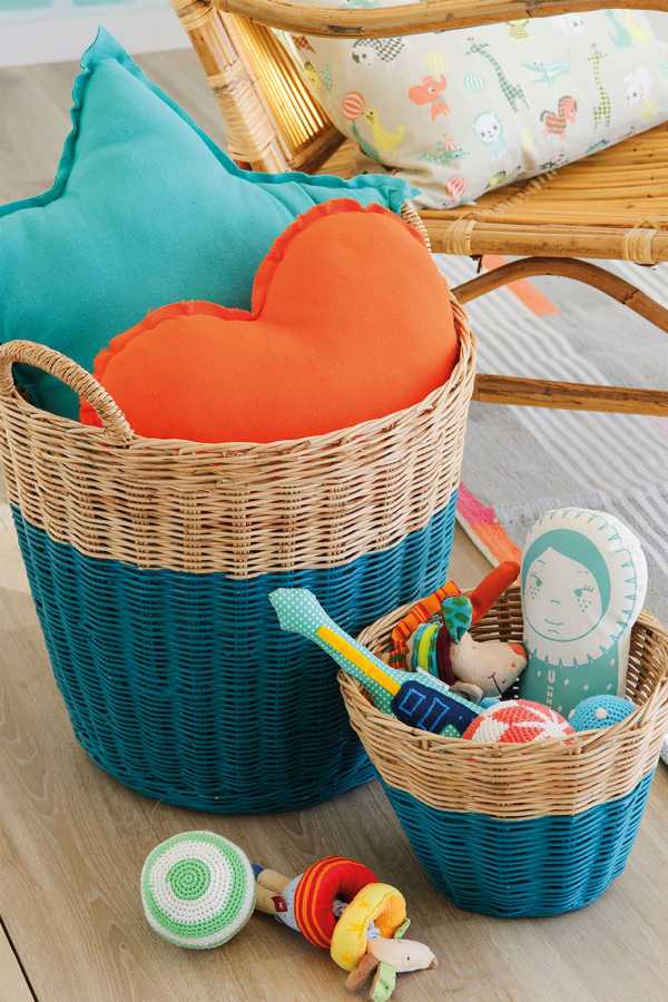Корзинки из ротанга или ткани на отлично справляются со своей миссией хранения игрушек. Плюс ко всему они являются украшением дизайна.