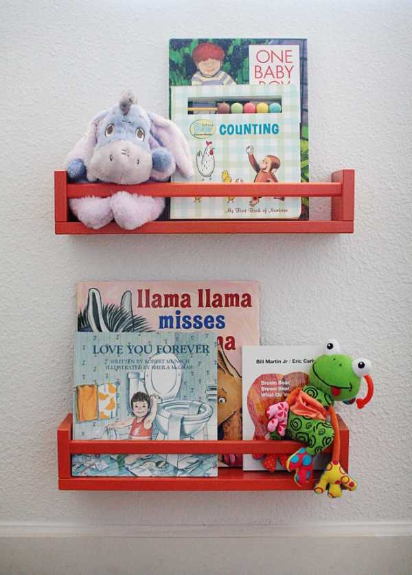 В качестве идеи для хранения игрушек можно задуматься о стеллаже с открытыми секциями. Только учтите, поддерживать идеальный порядок на таких полках вместе с ребенком непросто. Там рекомендуется хранить мягкие игрушки, книги и то, что можно красиво расставить. Основная же масса игрушек должна поселиться в другом более укромном месте.