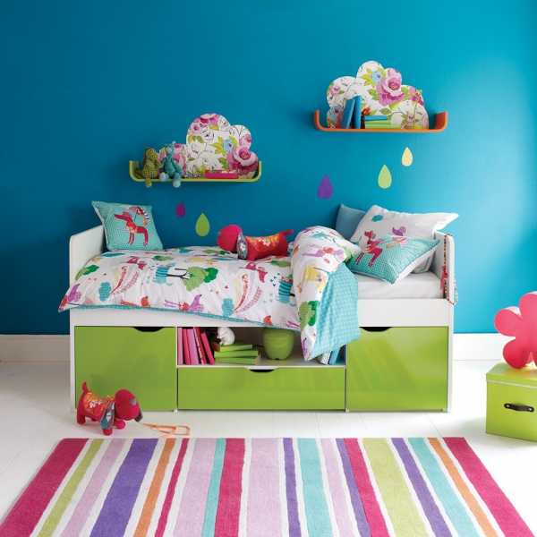 Не только страхи могут жить под кроватью. Родители часто забывают об этом месте, которое располагает большим пространством, выполняя роль надежного хранилища. Все виды контейнеров: картонные, металлические или пластиковые будут вписываться под кровать очень хорошо. Часто детская мебель уже оснащена выдвижными ящиками на колесах для хранения различных предметов. Выдвижные контейнеры под кроватью являются хорошим хранилищем не только для постельных принадлежностей, но и для прочих мелочей, например, игрушек. Интересным решением также являются ящички на колесах, которые после закрытия могут выступать в качестве игрушечных автомобилей, на которых ваш ребенок может кататься, отталкиваясь ногами.