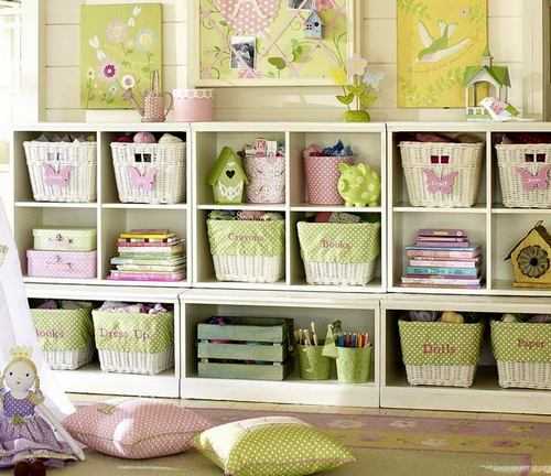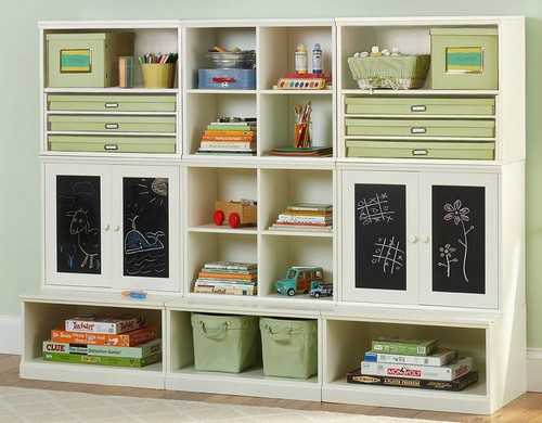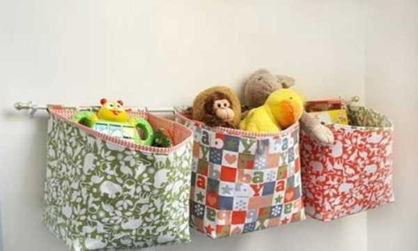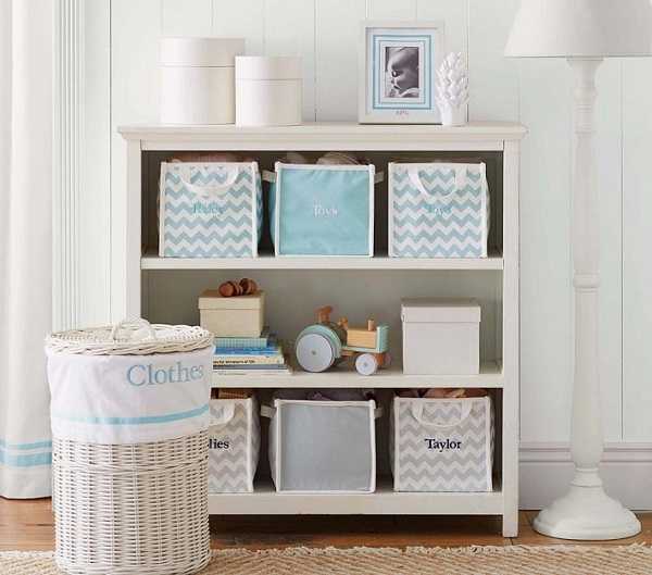 Обычные тканевые сумочки доступны в любом магазине, на ваш выбор многообразие цветов и узоров, так что подобрать подходящую расцветку под интерьер детской комнаты для мальчика или девочки не составит труда. Для классификации и удобства хранения Pottery Barn Kids советует поместить их в многоуровневый стеллаж. Главное, чтобы высота полки была на несколько сантиметров выше, чем контейнер, это обеспечит более лёгкое скольжение.