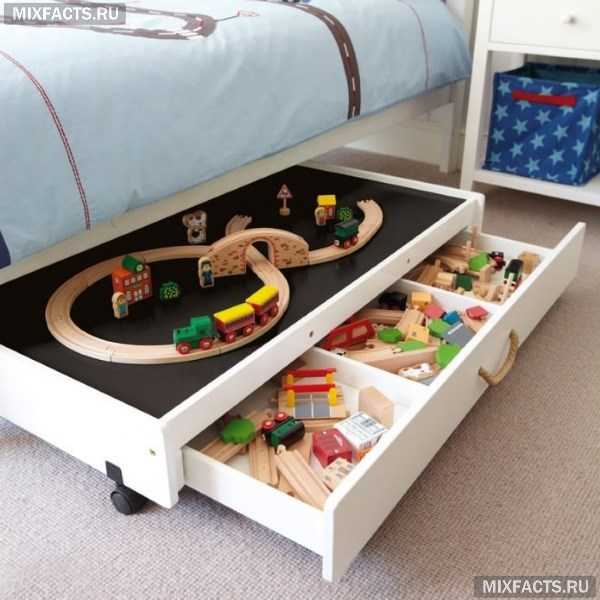 Выдвижные ящики под кроватью или столом станут также отличным вариантом для игрушек. Современные кровати для деток довольно часто оборудованы такими выдвижными ящичками.