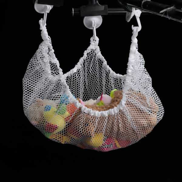 Сетка – это простой и недорогой вариант. В ней запросто размещаются мячики, роботы, пистолеты или куклы, с которыми регулярно играет чадо. Главное преимущество заключается в том, что размеры сетки меняются, ее легко растянуть.