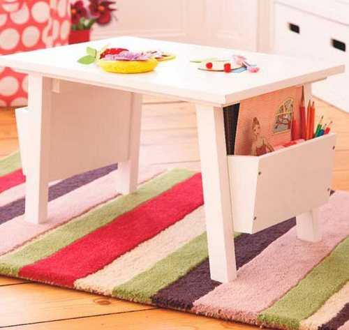 - Свой уголок. Если у ребенка будет свое правильно организованное для игр место, вероятность растаскивания игрушек по всему дому снизится. В детском пространстве обязательно должны быть: стол или парта с ящиками и полками для хранения принадлежностей для творчества, стульчик, пуфик, комод или корзина для игрушек, мягкий коврик для игр на полу. Стену можно покрыть краской с эффектом меловой доски, а рядом повесить на крючок ведерко с мелками и губку.