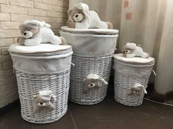 Корзины (плетеные, тканевые) послужат и элементом декора и местом для хранения игрушек. Плетеные корзинки вписываются в атмосферу эко стиля, ретро стиля, кантри, прованс и т.д. Тканевая корзина подойдет к любой стилевой направленности помещения.