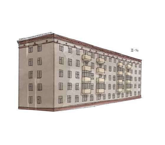 Серия пятиэтажек из силикатного кирпича II-14 особое распространение получила при застройке городов-спутников Москвы в 1957-1964 годах, в самой же Москве строилась меньше. Серия имеет все признаки хрущёвки, в том числе высоту потолка 248 см, этажность – 3-5 этажей и планировку.