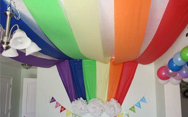 Зробити веселку своїми руками і піднятинастрій собі та оточуючим можна за допомогою рулонів гофрованого паперу або довгих відрізків різнокольорової тканини. Варто лише прикріпити один кінець рулону горфропаперу на стелі, а інший — закріпити, приміром на люстрі. Гадаю, тато з задоволенням допоможе Тобі перетворити дім на країну Чудес.