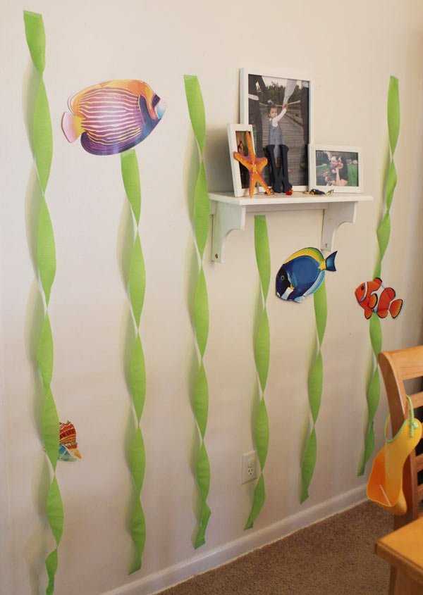 З тонких довгих смужок гофрованого паперу зроби водорості. Закрути їх спіраллю та приклей до стіни. Роздрукуй зображення екзотичних риб і також прикріпи на стіні.