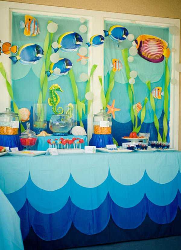 - тематика підводного світу – універсальна. Сюжети з рибками, медузами, коралами та перлинами ідеально підійдуть для оформлення святкової дитячої;