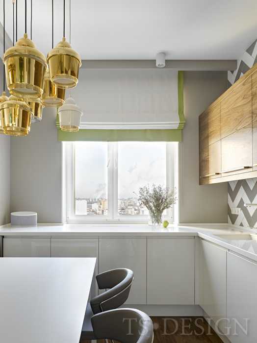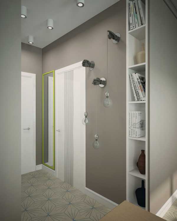В следующем интерьере классическое сочетание насыщенного серого, белого и бежевого оттенков дополнено броскими пятнами в виде зелёных абажуров, такого же тона батарей отопления и зеркальной рамы в прихожей, а также светло-жёлтых декоративных подушек, которые настраивают на позитив и поднимают настроение.