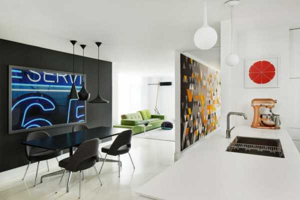 Так в белоснежной кухне мы видим салатово-зелёный чайник, оранжевый блендер и чёрное панно с ярким геометрическим орнаментом. Столовая поражает обилием угольно-чёрной краски — именно такой оттенок имеют обеденный стол, стулья и две декоративные перегородки.