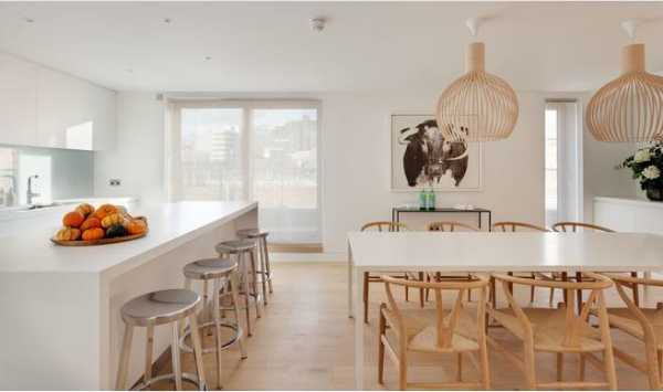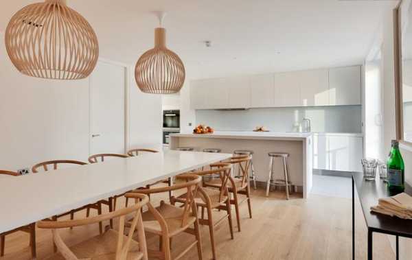 Стерильная белизна кухонной и столовой зон дополнена оттенком натурального дерева