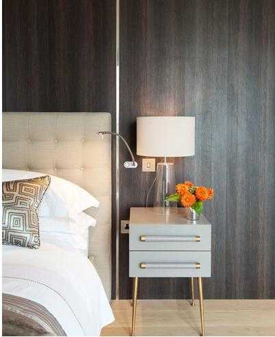 Нежный облик спальни разбавлен тёмными стеновыми панелями и парой броских пятен