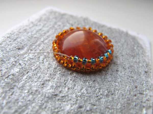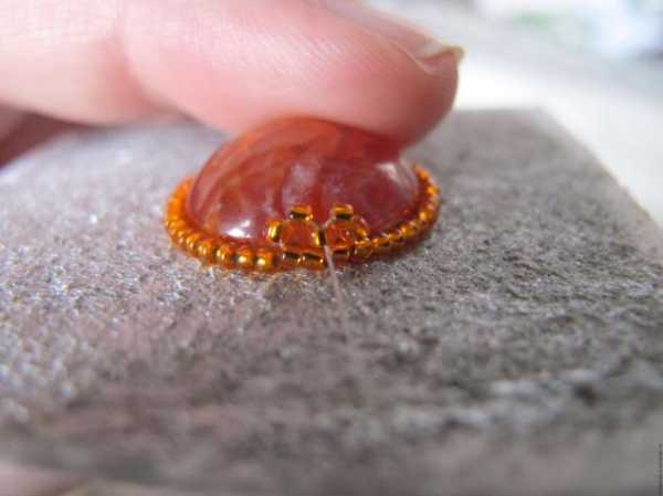 Вставив все бисерины проходим ниткой через крайние бисерины оправы ещё несколько раз хорошенько её затягивая. Теперь наша камень надёжно сидит в бисерной оправе и даже если вдруг клей подведёт, то камень никуда не денется.