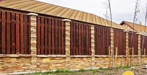 Коричневый забор впишется в любой ландшафт2. Наличие в конструкции заборов для частного дома кирпичных столбов предусматривает дополнительную отделку последних декоративным камнем или клинкером. Таким образом подчеркивается оригинальность и происходит выделение из общей безликой массы. Ограничить фантазию по декору забора могут только финансы. Пролеты в такой основе можно заполнить евроштакетником или металлом.