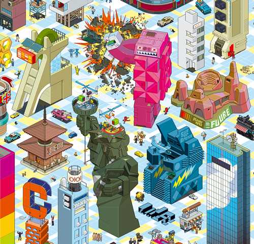 Иллюстрации Хуана выполнены в изометрической проекции. Они реалистичны, безукоризненно выверены и продуманы. Эти работы переносят нас в свой альтернативный мир видео-игр и пиксельной графики, живущий по звоим законам. Просто фантастика.