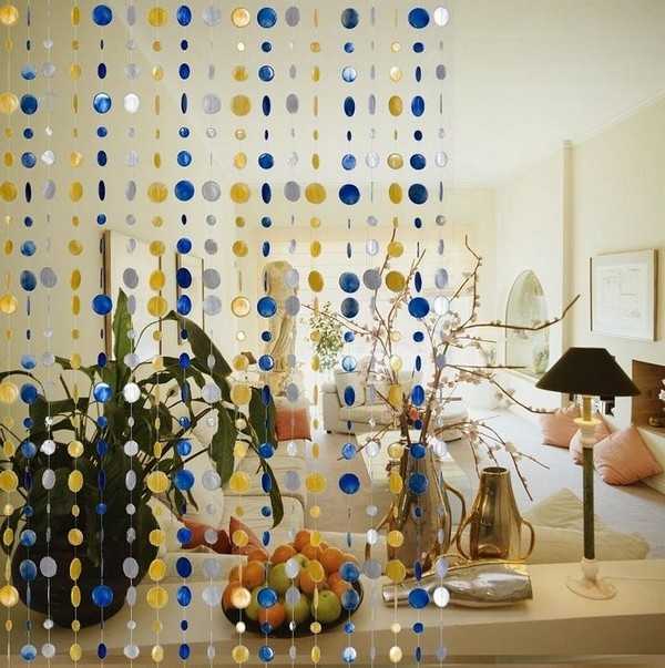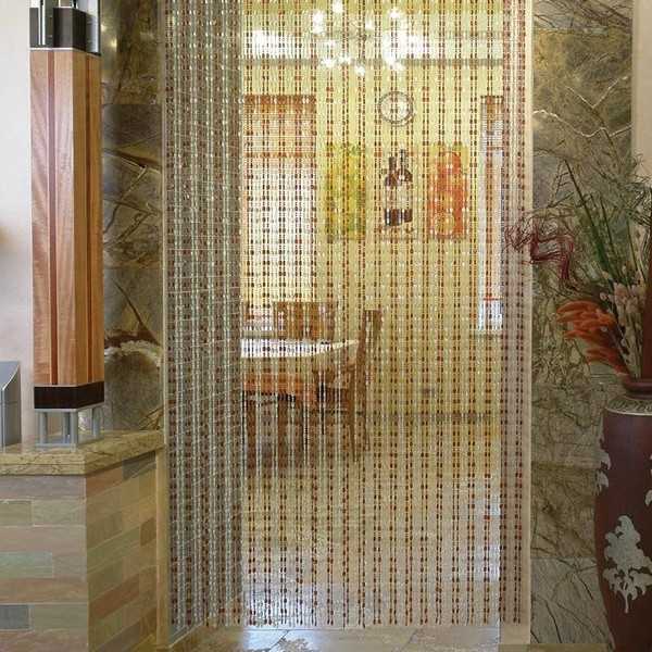 Это красивый и современный материал для дверного проема. Отличаются легкостью и невесомостью. Могут использоваться однотонные и разноцветные нити, что зависит от цветовой гаммы помещения. Занавески в дверной проем можно приобрести из стекляруса, украсить помещение с сочетанием нитяных штор с бархатными или тканевыми материалами.