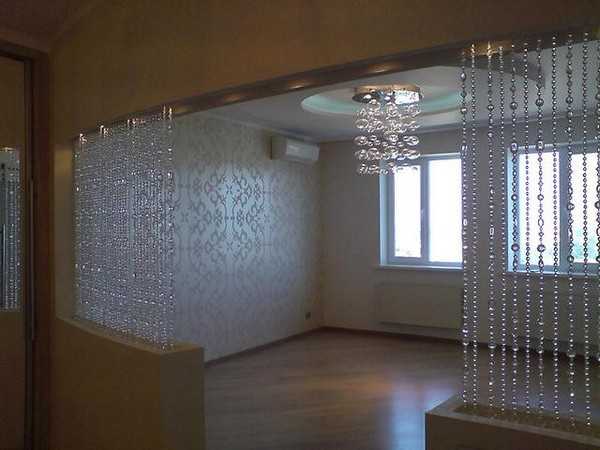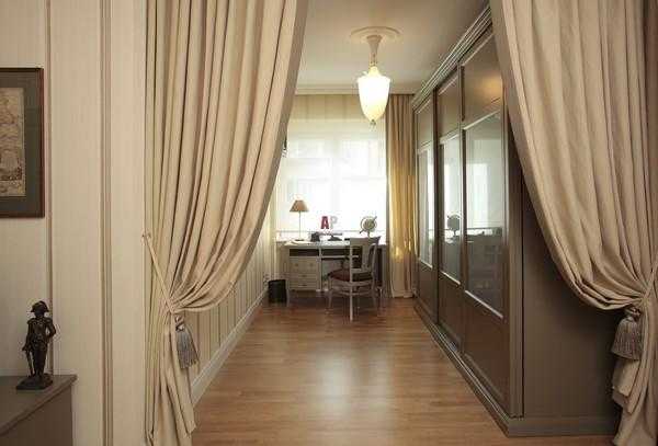 Совет: Чтобы избежать резкого перехода между помещениями, следует вешать портьеры. Они будут условно делить прихожую и кухню, коридор и гостиную, защитят от насекомых. Портьеры помогут скрыть неровности стен, они подойдут для нестандартных проемов.
