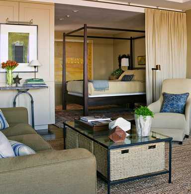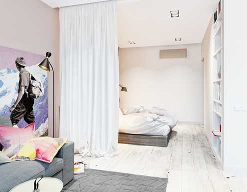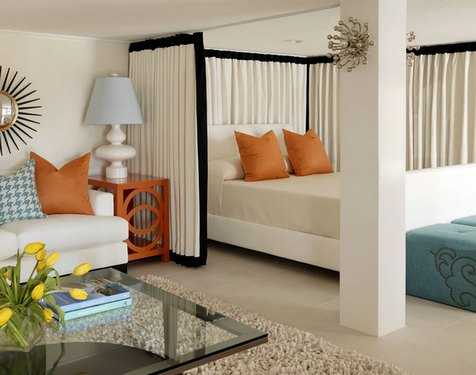 5. Для разделения зон допустимо использование двух типов драпировки, как принято в оформлении окон: одна — легкая и прозрачная, другая — более темная и плотная. Чтобы во всех зонах было светло, оставляют задвинутой только легкую занавеску, но если возникает необходимость сделать одну из зон более закрытой — в ход идет плотная штора.