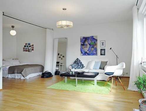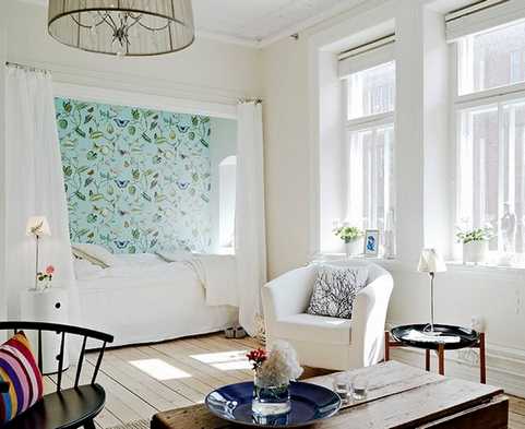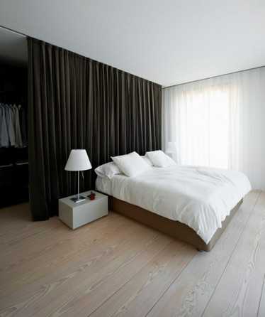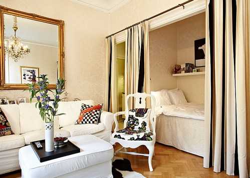 Занавески как легкие ширмы используются для зонирования в квартирах-студиях и в комнатах, в которых спальня объединена с другой функциональной зоной: гостиной, кабинетом, детской.