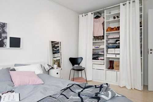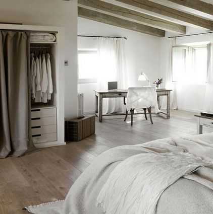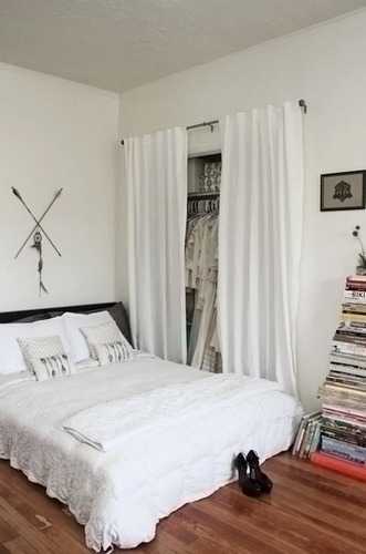 Вообще, именно в спальнях шторы вместо дверей и перегородок наиболее органичны, ведь здесь всегда присутствует много текстиля. Поэтому для встроенного (и не только) шкафа или мини-гардеробной в спальне двери необязательны — с их функцией идеально справляются шторы, абсолютно гармоничные здесь.