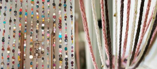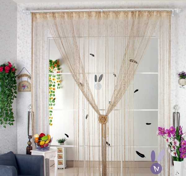 Нитяные, веревочные занавески пришли к нам из стран Востока. У них несколько названий: кисея, дождь, лапша. Такие занавески делают из натуральных или синтетических материалов, могут быть украшены бусинами, стеклярусами, валяными из шерсти шарами. Их можно стирать, прослужат долго при правильном уходе. Шторы могут вязать крючком или плести макраме. На них может наноситься определенный рисунок, будут выглядеть, как картина, это уже фотошторы. Также популярны шторы из бамбука.