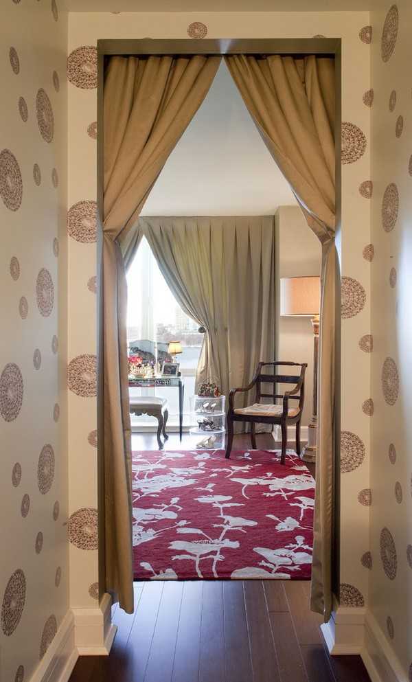 Применяют ткани и для оформления дверных проемов между помещениями в том случае, когда не требуется соблюдения приватности.
