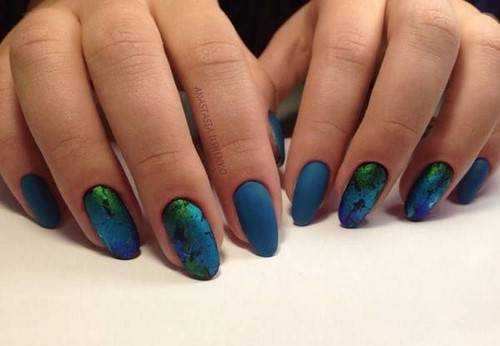 Втирки и частички фольги позволят реализовать необыкновенный зеленый маникюр 2019-2020 в разных фактурах, в том числе технике «битое стекло».