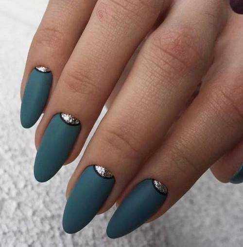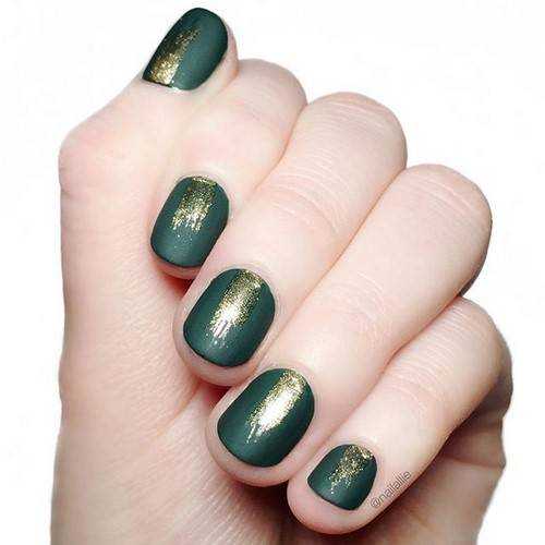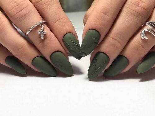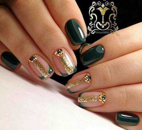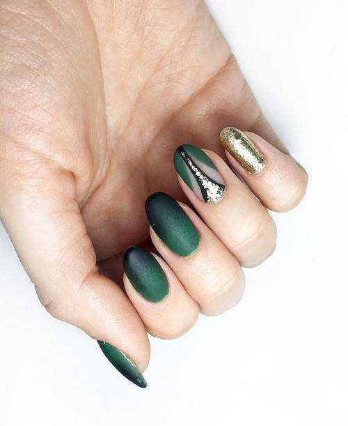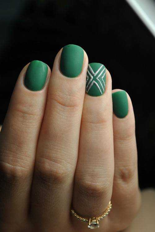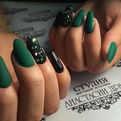 Если же добавить к зеленому матовому гель-лаку стразы, микро бисер или глиттер, вы получите ошеломляющий nail-art к шикарному вечернему наряду в пол.