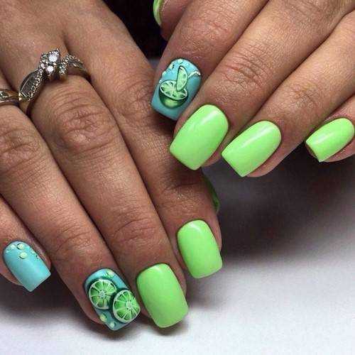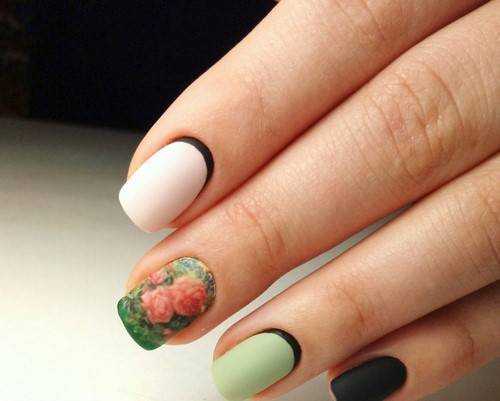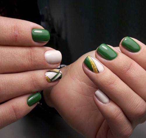 Зеленые ногти вы можете скомбинировать с белым, черным, желтым, красным, синим, зеленым, фиолетовым и другими приятными вариациями цвета, что позволит реализовать нетривиальные новинки сезонного дизайна в зеленых оттенках с рисунками и узорами.