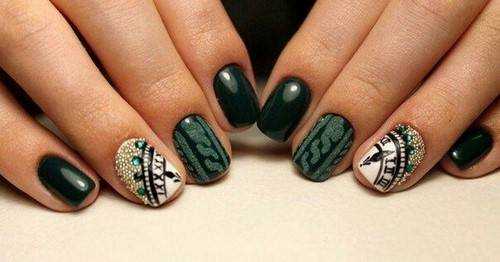 Выше мы упомянули пудровые узоры на ногтях зеленого цвета, но кроме этой техники зеленый маникюр 2019-2020 может прекрасно получиться, если мастер испробует на ваших ноготках узоры на мокром геле, ажурные узоры, стильные орнаменты и принты, которые возможно нанести с помощью стемпинга и слайдеров.