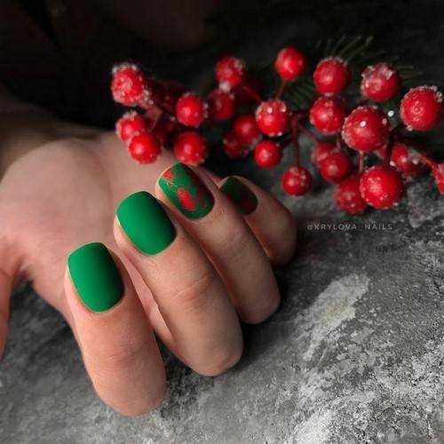 Неповторимый зеленый маникюр 2019-2020 и с сезонными рисунками. Особенно стоит отметить стильный зеленый дизайн маникюра на Новый год, который можно украсить снежинками, вензелями, милыми рожицами, зимними пейзажами и мотивами, контрастной атрибутикой.
