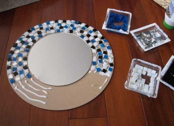 На заключительном этапе нашего мастер-класса мы декорируем зеркало зеркальной мозаикой. Как видите, наличие именно такой мозаики не критично, вы можете заменить ее бусинами или декоративным серебряным шнуром.