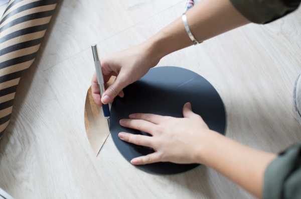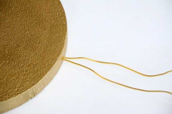 На лист пенополистерола кладем зеркало и обводим его карандашом. Отступаем буквально 2 см и обводим еще один круг. Аккуратно вырезаем ножом заготовку. Окрашиваем ее в золотой цвет и оставляем до высыхания.