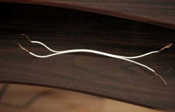 Для начала нужно разделить часть синего от белого провода на куски сантиметров по 15, и вывести их в отверстия для лампочек. В итоге в каждом отверстии должно получится 2 синих и 2 белых провода, так как показано на фото.