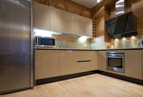 Дизайн типичной отечественной гостиной- К кухням в подобной расцветке мы уже привыкли. Этот цвет отлично вписывается в стилистику этого помещения, наполняет его уверенностью и чистотой. Обои цвета стали на кухне подчеркивают общий антураж этой комнаты, гармонируют с бытовой техникой, поэтому могут стать отличным общим фоном.